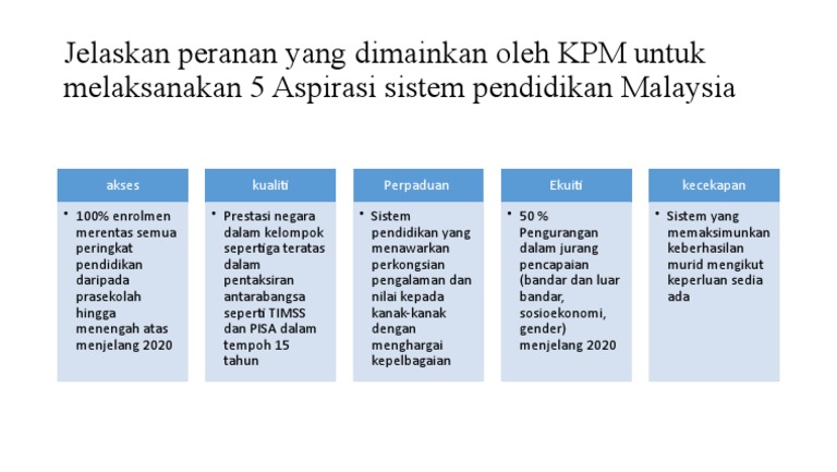 Pelan ini melakarkan visi sistem pendidikan dan aspirasi. Lima Aspirasi Sistem Pendidikan Malaysia Pdf 5 Aspirasi Pdf 5 Aspirasi Pendidikan Ulisesrkc Pelan Pembangunan Pendidikan Malaysia Panitia Matematik Smk Semop Daro Aspirasi. 5 Aspirasi Sistem Pendidikan Malaysia PPPM 2013-2025 Pelan pembangunan pendidikan ini berhasrat untuk mencapai lima keberhasilan teras pendidikan bagi menentukan kejayaaan.